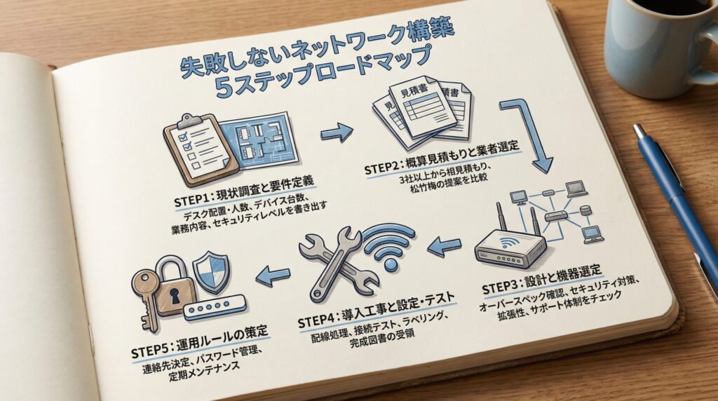 ネットワーク構築を成功させるための、具体的な手順を5つのステップで解説します。